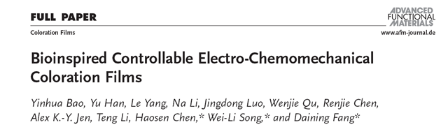 2018 年11月17日,著名材料学期刊 《先进功能材料》 (Advanced Functional Materials, 2018, 1806383.)在线报道了bb贝博艾弗森官方网站先进结构技术研究院方岱宁院士,陈浩森副教授,和宋维力副教授合作领导研究的一种全新的基于电化学精确控制的,硅基电化学-力学-光学耦合仿生变色器件。该项研究基于全新的电化学-力学耦合变色调控机理,实现了可见光宽频段精确调控,并具有独特的彩色/银色切换功能。