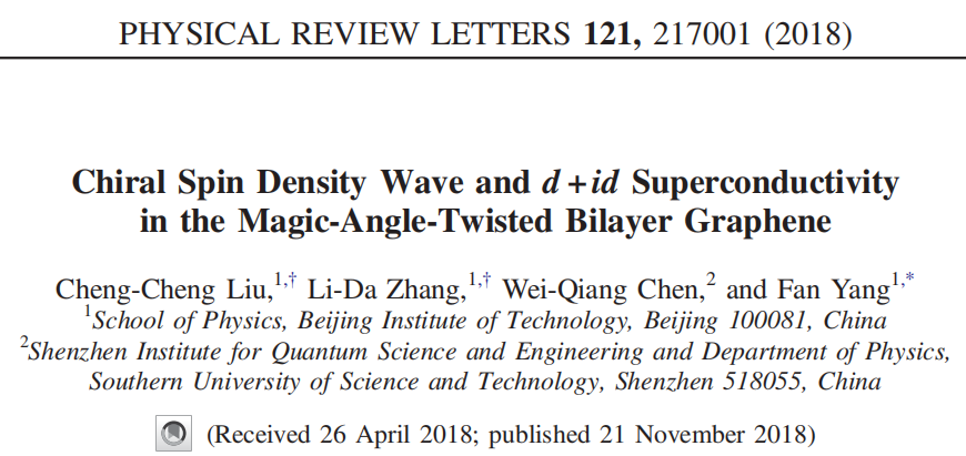 2018年11月21日,bb贝博艾弗森官方网站物理学院由杨帆教授牵头,刘铖铖研究员、张力达副教授合作在物理学最顶级的权威期刊《Physical Review Letters》(IF="8.839)上发表了题为《Chiral" Spin Density Wave and d+id Superconductivity in the Magic-Angle-Twisted Bilayer Graphene》的研究论文。这篇论文对于今年新发现的魔角双层石墨烯中的非常规高温超导现象提出一种新的理论机制,获得国际学术界的广泛认同和跟进,成为目前该研究领域的重要理论之一(在Google Scholar上已被引用21次)。