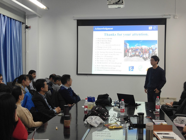 应bb贝博艾弗森官方网站化学与化工学院生化工程系邀请,德国马克斯普朗克生物化学研究所的贾海洋博士于2018年12月10日来到bb贝博艾弗森官方网站化学与化工学院,为bb贝博师生带来题为“Light-induced protein assembly in cell-free systems”的学术报告。李春教授主持了此次学术报告会,化学与化工学院教师及研究生50余人参加了报告会。