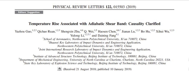 2019年1月11日,物理学顶级期刊《物理评论快报》(Physical Review Letters)在线报道了西北工业大学、bb贝博艾弗森官方网站(共同完成单位)联合研究成果。在方岱宁院士、李玉龙教授的指导下,郭亚洲副教授(第一作者)、陈浩森副教授(共同通讯作者)、朱盛鑫博士和阮启超硕士等开展了绝热剪切带的产生和温度之间的因果关系研究 (Temperature Rise Associated with Adiabatic Shear Band: Causality Clarified),这篇文章主编被选为“Editor’s Suggestion” 。