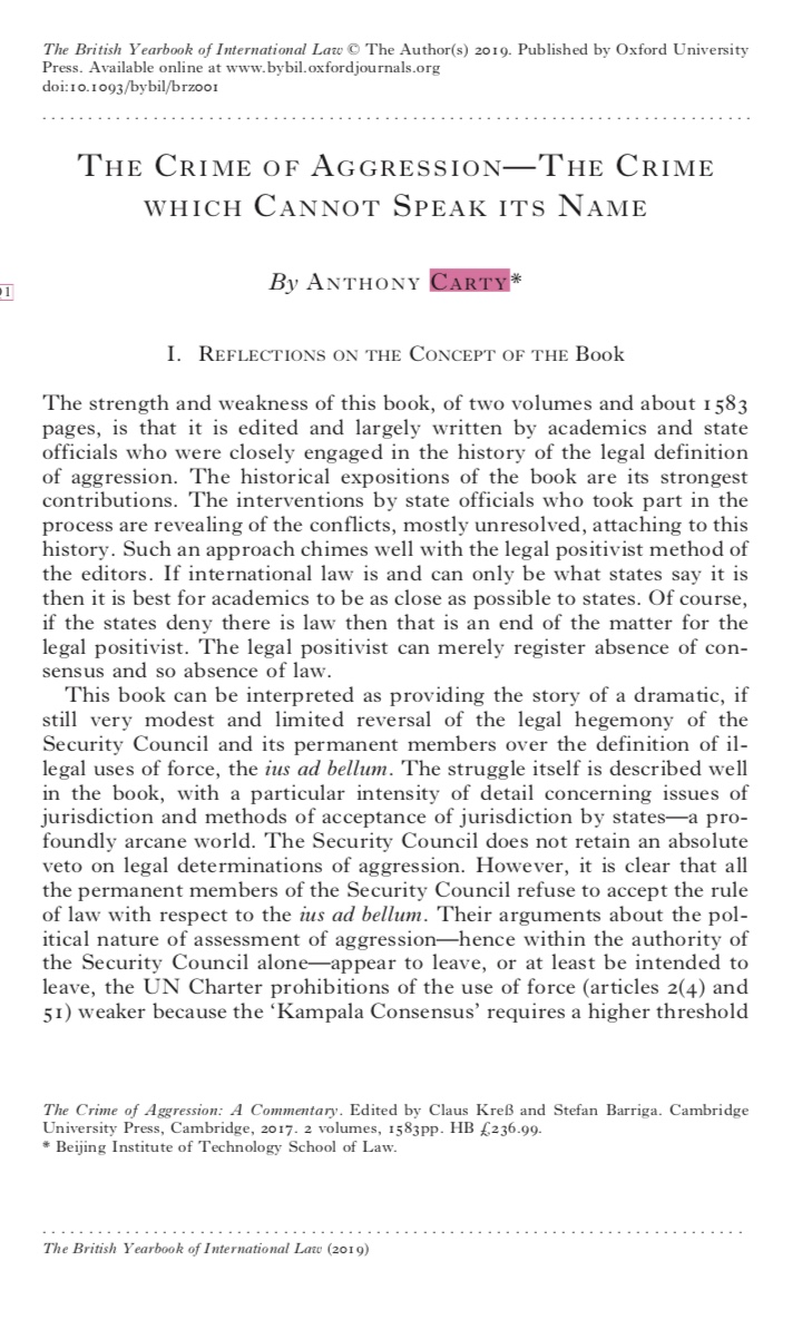 在英国国际法年刊上发表的The Crime of Aggression –The Crime which Cannot Speak its Name一文分析了将侵略罪引入《国际刑事法院规约》的法律意义。文章认为,安理会常任理事国拒绝接受编纂该法律的做法是明智的,否则会违背《联合国宪章》禁止使用武力规则。Carty认为,国际社会有必要重新考虑国际法的基础,从而克服各国间彼此感到的巨大焦虑和不安。要维护世界和平,需要各国人民重新发现并对正义、相互尊重和相互理解达成共识.