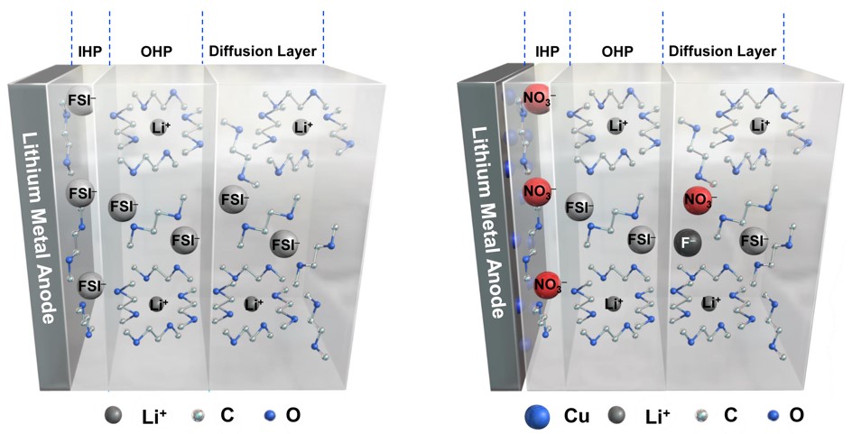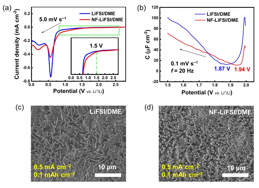黄佳琦课题组在保持电解液体相具有一致锂离子溶剂化结构前提下,把研究重点聚焦在内亥姆霍兹层的特性吸附方面。首先采用模拟计算推测出硝酸根(NO3−)阴离子在硝酸根(NO3−)、氟离子(F−)、双氟亚胺离子(FSI−)和乙二醇二甲醚(DME)等多种组分竞争环境下的优势吸附特性,并通过非法拉第过程和法拉第过程的电化学实验进行了验证(图2)。结合HADFF-STEM及XPS深度溅射分析技术关联了特性阴离子吸附对SEI形成过程及对锂沉积形貌的影响,发现NO3−诱导产生的SEI无机组分主要以氮氧化锂(LiNxOy)为主,该SEI界面能够促进金属锂的球状沉积,提高金属锂的循环利用率;而FSI−诱导产生的SEI无机组分主要以LiF形式存在,该SEI易诱导金属锂的枝晶状沉积。