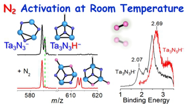 近日,bb贝博化学与化工学院马嘉璧副教授团队通过质谱实验、阴离子光电子能谱实验和高精度量子化学计算相结合的方法对N2与Ta3N3H−和Ta3N3−气相团簇的反应性及结构进行了深入研究,得到了首例能够固定并完全活化N2分子的过渡金属氮化物团簇,揭示了H配体在反应中的重要作用。相关成果以“Dinitrogen Fixation and Reduction by Ta3N3H0,1− Cluster Anions at Room Temperature: Hydrogen-Assisted Enhancement of Reactivity”为题,发表在国际重要期刊《Journal of the American Chemical Society 》(IF= 14.695,DOI:10.1021/jacs.9b03168)。化学与化工学院硕士生赵越为该论文的第一作者,马嘉璧副教授、德国Fritz-Haber研究所的André Fielicke、西华大学的胡连瑞老师为论文的共同通讯作者。