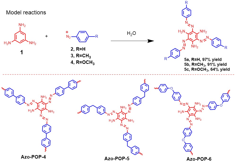 图2 Azo-POP-4、Azo-POP-5和Azo-POP-6的结构及其模型反应