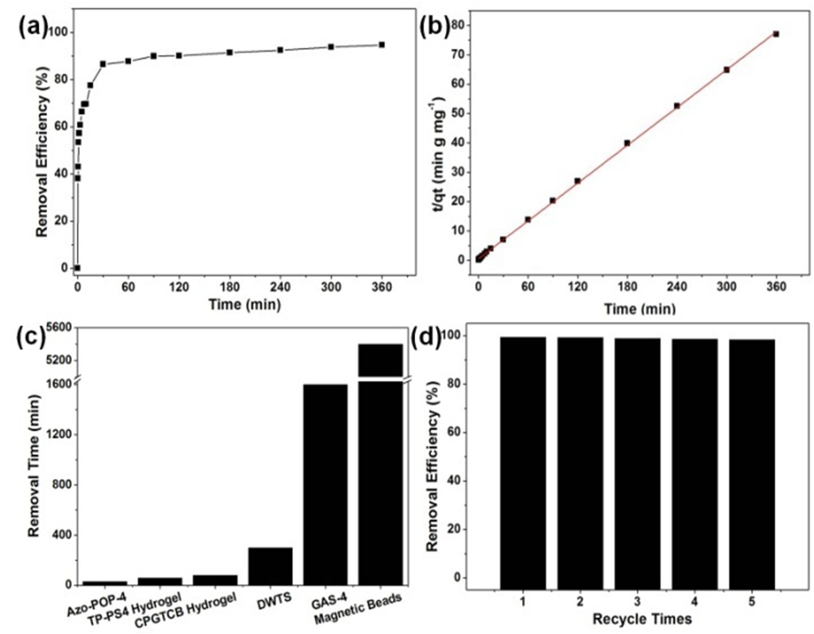 Azo-POP-4~6具有大量的邻氨基-偶氮基团,对水中的铜离子(Cu2+)具有较强的吸附能力。Azo-POP-4能够在30分钟内快速地从水中去除85%的Cu2+,吸附速率快于文献报道的其它吸附剂,循环使用5次仍对Cu2+保持优异的吸附能力(图3)。