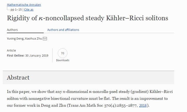 日前,bb贝博艾弗森官方网站数学与统计学院邓宇星副研究员在国际顶级学术期刊《Mathematische Annalen》在线发表题为“Rigidity of k-noncollpased steady Kaehler-Ricci solitons”的研究论文。该论文研究了具有非负双全纯截面曲率的体积非塌稳态型缩凯勒-里奇孤立子(steady Kaehler-Ricci solitons)的刚性,证明了具有非负双全纯截面曲率的体积非塌缩凯勒-里奇孤立子必然是平凡的。作为该定理的应用,论文还证明了长时间存在的凯勒-里奇流必然是体积极大增长的度量所生成的凯勒-里奇流。