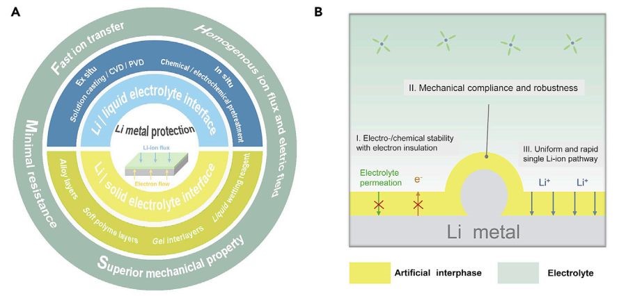 锂金属电池(LMBs)具有显著优于传统锂离子电池的高能量密度,但由于锂负极超高化学反应活性,几乎会与所有的非水性液体电解质形成固态电解质界面(SEI),这种极度不稳定的SEI严重限制了LMB的应用。科研人员通常采取电解质添加剂、锂盐和溶剂优化、高浓度电解质和纳米结构电解质等提高SEI的稳定性。但是在长期服役过程中,SEI仍然存在许多不足:化学异质性,机械脆性,不同工况条件下的成分与结构差异等。合理设计稳定的界面,为实现安全稳定的金属锂负极应用提供重要保障。