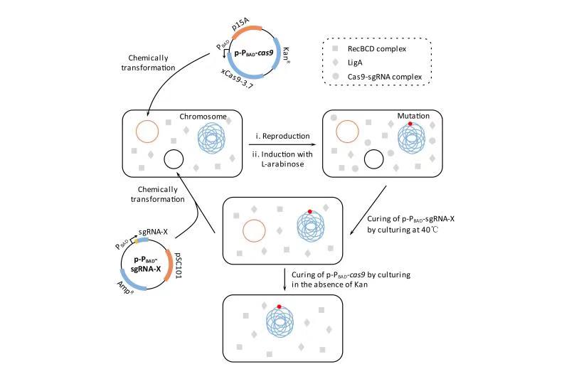 bb贝博艾弗森官方网站生命学院的霍毅欣教授课题组利用David Liu课题组开发的 xCas9-3.7(SpCas9的进化版突变体)和Jennifer Doudna课题组改造的sgRNA(tracrRNA : crRNA的强化版融合体)构建了一个双质粒严谨诱导型的基因组编辑系统,并将其命名为CNEE。该系统极为简单,其功能组件只有Cas9和sgRNA,没有任何外源的DNA修复蛋白,利用该系统,即使宿主的DNA修复系统效率极低,也能高效率地进行基因组编辑。该课题组将CNEE系统导入大肠杆菌,在宿主A-EJ系统的协助下,实现了高效的基因敲除和长达83 kb的大片段删除(图1)。这种方法不需要编辑模板,可以实现快速迭代的大肠杆菌遗传改造,并且编辑效率不依赖于高转化活性的宿主细胞。由于RecBCD和LigA(或它们的同源基因)在所有的原核生物中都存在,因此理论上CNEE系统适用于任何原核生物的基因组编辑。随后,该课题组在CNEE的基础上构建了一个变异系统,为了方便描述,暂且把该系统称为CNEE-V1。将CNEE-V1导入大肠杆菌,可以在宿主RecA同源重组系统的协助下实现高效精确的基因组编辑,包括序列的删除、插入和替换。CNEE-V1是对CNEE的有效补充;由于RecA(或它的同源基因)在所有的原核生物中都存在,因此理论上CNEE-V1也适用于任何原核生物的基因组编辑。此外,该课题组还证明,将分枝杆菌来源的NHEJ系统引入CNEE可以进一步增强CNEE的性能;同样,将噬菌体来源的λ-Red系统可以进一步增强CNEE-V1的性能。相关成果发表于TOP(顶级)期刊《Applied Microbiology and Biotechnology》,原文链接:https://doi.org/10.1007/s00253-019-10104-w