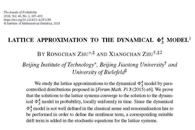 场给出刻画,相关工作发表于国际数学一流期刊在《Communication in mathematical physics》《Journal of functional analysis》等。这些结果受到Hairer、Gubinelli等数学家的高度关注。Gubinelli教授在2018国际数学家大会上引用了朱蓉禅副教授及其合作者的最新研究结果。