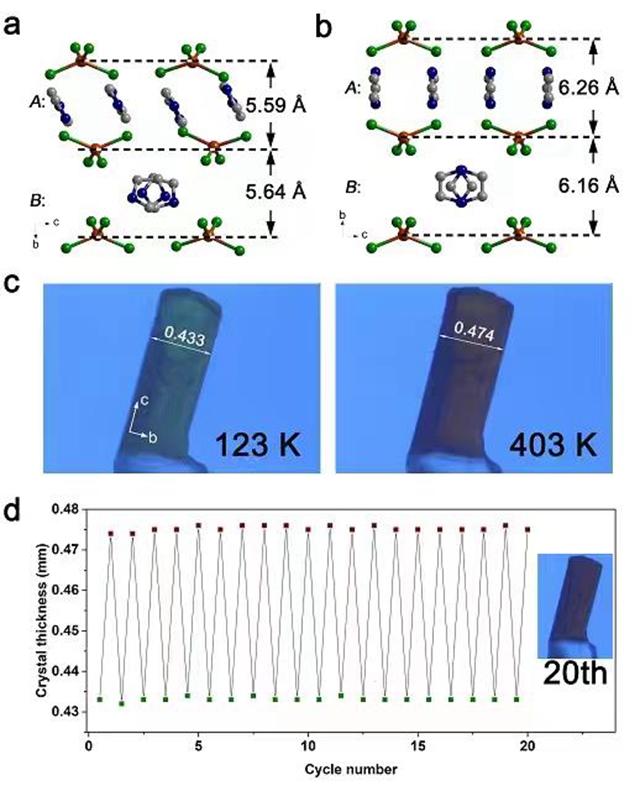 该课题组在前期草酸根离子分子转动研究工作的基础上 (Nature Chemistry, 2014, 6, 1079-1083;Angew. Chem. Int. Ed. 2017, 56, 717-721),受陀螺、轮子等宏观进动现象的进一步启发,提出了以分子轮作为熵源,利用分子轮“进动”驱动单晶材料巨热膨胀的设计思路。通过化学热力学控制分子轮 (咪唑阳离子) 静止-转动过程中的分子指向变化这一“进动”行为,设计开发了一种新型的巨热膨胀材料。该材料在一个方向表现出极大的正热膨胀 (α = 839 × 10−6 K−1),而在垂直方向表现出巨负热膨胀性质 (α = −363 × 10−6 K−1)。伴随着巨热膨胀,单晶材料的宏观尺寸可发生10%的机械伸缩,并且几十次循环后未发现明显性能变化,表明该材料机械性质具有良好的抗疲劳性。结合变温单晶X−射线衍射,变温固体NMR测试、理论计算以及Hirshfeld表面分析,作者对分子运动的详细机理进行了深入的研究分析,为今后相关材料的设计开发提供了进一步的研究思路。