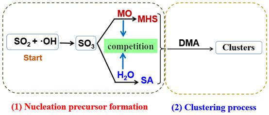 图1 成核前驱体(硫酸(SA)和硫酸甲酯(MHS))的竞争生成过程及其后续形成团簇的过程。甲醇:MO,二甲胺:DMA。