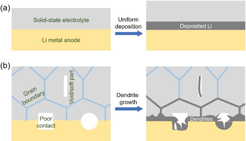 图1(a)无缺陷的理想固态电解质具备抑制枝晶生长的潜力;(b)实际固态电解质由于自身缺陷和较差的界面行为,存在严重的金属锂枝晶生长行为。