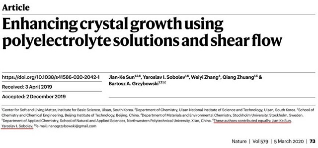 近日,bb贝博艾弗森官方网站化学与化工学院孙建科教授以《Enhancing crystal growth using polyelectrolyte solutions and shear flow》为题,将其“剪切促进晶体生长”研究成果发表于《Nature》杂志上(Nature 2020, 579, 73-79)。孙建科为该论文的共同第一作者,化学与化工学院为共同合作单位,排名第三。此研究是与韩国基础科学研究院Bartosz Grzybowski 教授合作完成。