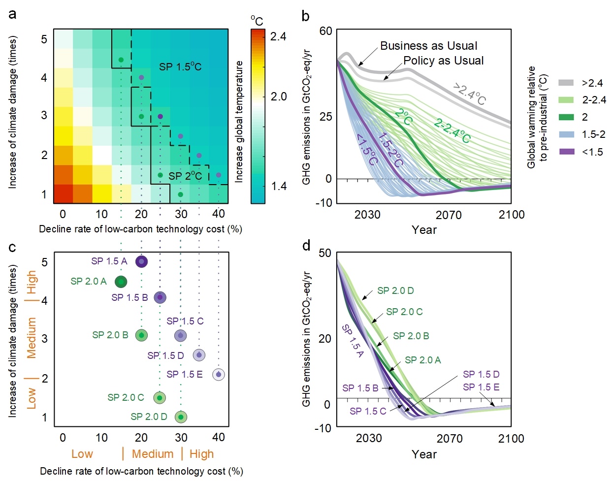 应对气候变化需要全球各国集体行动。2015年12月,缔约方通过《巴黎协定》,并明确了本世纪末将全球温升控制在不超过工业化前2度的目标,并将1.5度温控目标确立为应对气候变化的长期努力方向。《巴黎协定》规定各缔约方每五年提交一次“国家自主减排贡献”(NDC),由各国自主制定减排目标。但现有多数研究表明,国家自主减排贡献无法满足2度和1.5度温控目标的要求。为使NDC与全球温控目标不断趋近,《巴黎协定》设置了动态评估机制,要求各国依据自身减排能力逐期增加减排量。然而,出于短期经济发展考虑,国家或地区可能拒绝增强短期行动力度,这对后巴黎时代全球气候治理提出了严峻挑战。在此背景下,量化温控目标下的各国行动方案对应的潜在收益和成本,有助于提高国家应对气候变化的积极性,推动全球气候治理进程。