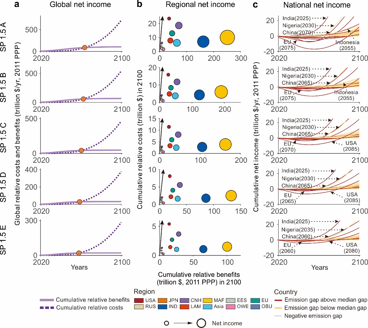 研究团队基于模型结果,编制了后巴黎协定时代实现温控目标的国家自主减排贡献改进的全球方案;预测了不同方案下各国扭亏为盈的时间;量化了实现扭亏为盈的前期投资,为NDC目标更新、全球盘点以及国家间资金和技术转移提供了科学依据。