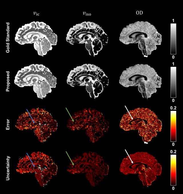 为了解决这些问题,研究团队提出了一种改进的深度网络,其在自适应地结合历史信息的同时,应用空间域与角度域分离的字典对信号进行稀疏表示,再将信号稀疏表示以可分离的形式映射到神经组织结构重建结果。此外,该方法基于稀疏表示形式,利用Lasso Bootstrap策略,对神经组织结构重建结果进行了不确定性量化。团队利用公开的大脑弥散磁共振成像数据集,在不同的信号模型上验证了所设计的方法,其准确性显著优于现有的方法,并且得到了有意义的不确定性量化结果。该项工作为基于弥散磁共振成像的神经科学研究提供了重要的计算新思路。