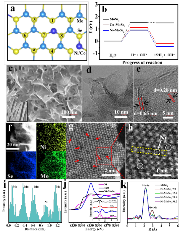 图1:Ni/Co-MoSe2结构模型及催化剂形貌和结构表征。