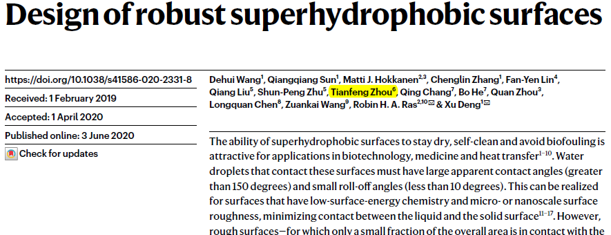 6月3日,《Nature》正式刊发了bb贝博艾弗森官方网站周天丰教授与电子科技大学邓旭教授团队和芬兰阿尔托大学Robin H. A. Ras教授的研究成果“Design of robust superhydrophobic surfaces”,并被选为当期封面。该论文提出去耦合机制将表面浸润性和机械稳定性拆分至两种不同的结构尺度,通过在两个结构尺度上分别进行最优设计,为超疏水表面创造出具有优良机械稳定性的微结构“铠甲”,解决了超疏水表面机械稳定性不足的关键问题。