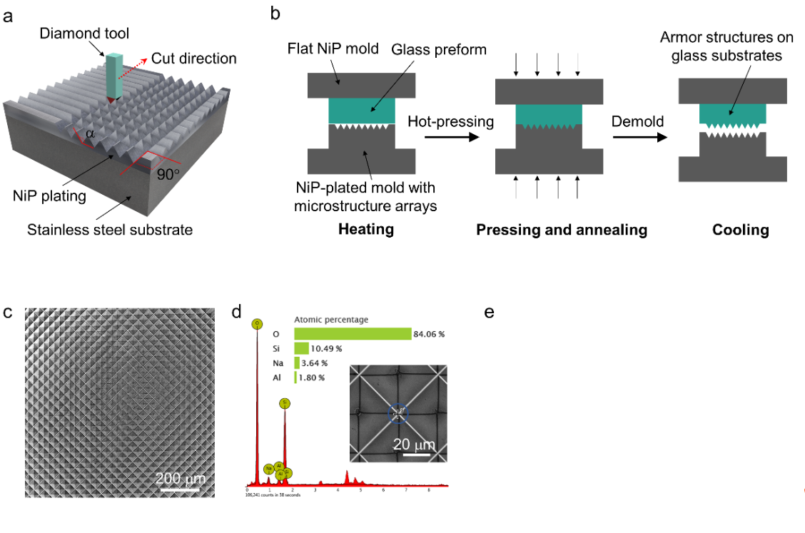 该论文基于全新思路,首次通过去耦合机制将超疏水性和机械稳定性拆分至两种不同的结构尺度,并提出微结构“铠甲”保护超疏水纳米材料免遭摩擦磨损的概念。玻璃铠甲化表面在集成高强度机械稳定性、耐化学腐蚀和热降解、抗高速射流冲击和抗冷凝失效等综合性能的同时,还实现了玻璃铠甲化表面的高透光率,为该表面应用于自清洁车用玻璃、太阳能电池盖板、建筑玻璃幕墙创造了必要条件。bb贝博艾弗森官方网站发挥其在玻璃微纳结构制造方面的优势,利用玻璃模压成形法实现了倒金字塔阵列微结构的玻璃铠甲制造。该论文创新的设计思路和通用的制造策略展示了铠甲化超疏表面非凡的应用潜力,必将进一步推动超疏水表面进入广泛的实际应用。