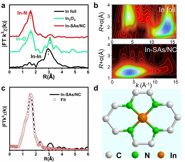 主族金属In作为一种电催化CO2还原选择性制备甲酸盐的催化剂,越来越受到人们的关注。尽管纳米结构的金属In、In2O3和In2S3等已被设计用来提高催化性能,但新型高效的In基催化剂,还亟需进一步研究。近日,陈文星等设计了一种锚定在金属有机骨架(MOF)衍生的氮掺杂碳载体上、具有Inδ+-N4原子界面结构的In单原子催化剂(In-SAs/NC)。该催化剂具有优异的CO2RR性能,在-0.65 V时,In-SAs/NC获得96 %的最大法拉第效率(FE)且最优的转换频率(TOF)高达12500 h−1,优于大多数同类催化剂。此外,基于同步辐射的X射线吸收精细结构(XAFS)研究表明,Inδ+-N4原子界面结构对于电催化CO2RR具有较高的催化活性,且催化过程中Inδ+-N4原子界面结构键长缩短。DFT理论模拟计算结果表明,Inδ+-N4原子界面对于甲酸盐中间体(HCOO*)具有较低的自由能,有利于提高催化剂对CO2RR的催化活性。该工作为合理设计面向能源应用的主族金属催化剂提供了新的途径。