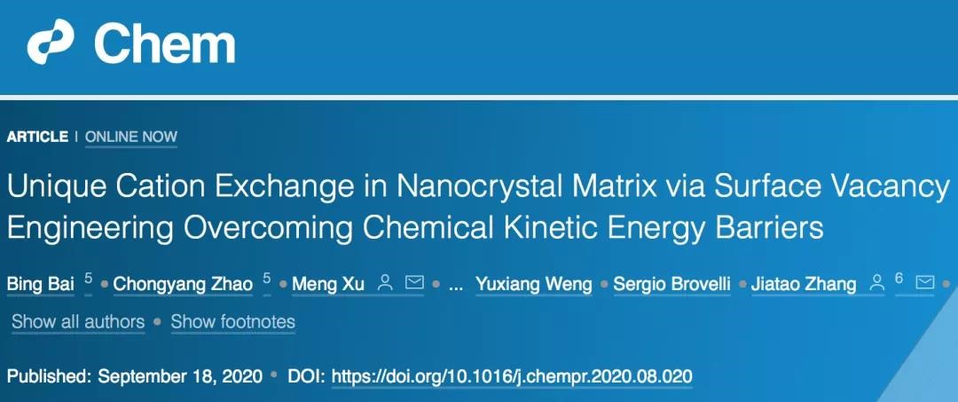 可控掺杂引起的精准能带工程是光电新能源应用的半导体纳米材料关键前提。近日,bb贝博艾弗森官方网站张加涛教授团队利用表面空位成功克服离子交换反应当中的动力学势垒,创新性提出了新的合成方法,在制备双异价离子掺杂半导体纳米晶/量子点的研究中取得重要进展,相关成果以“Unique Cation Exchange in Nanocrystal Matrix via Surface Vacancy Engineering Overcoming Chemical Kinetic Energy Barriers” 为题,于Cell旗舰杂志《Chem》在线发表(IF:19.735)(文章DOI: 10.1016/j.chempr.2020.08.020)。