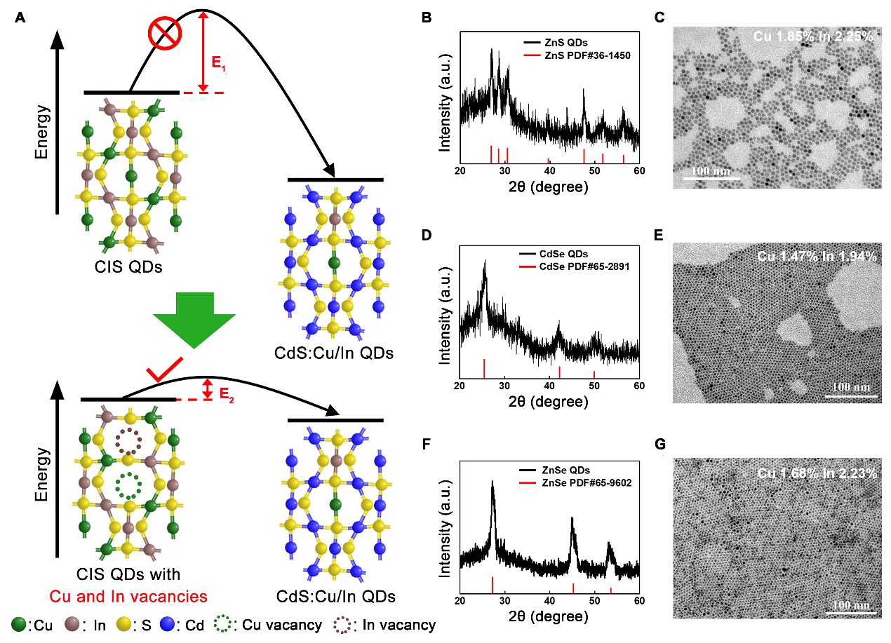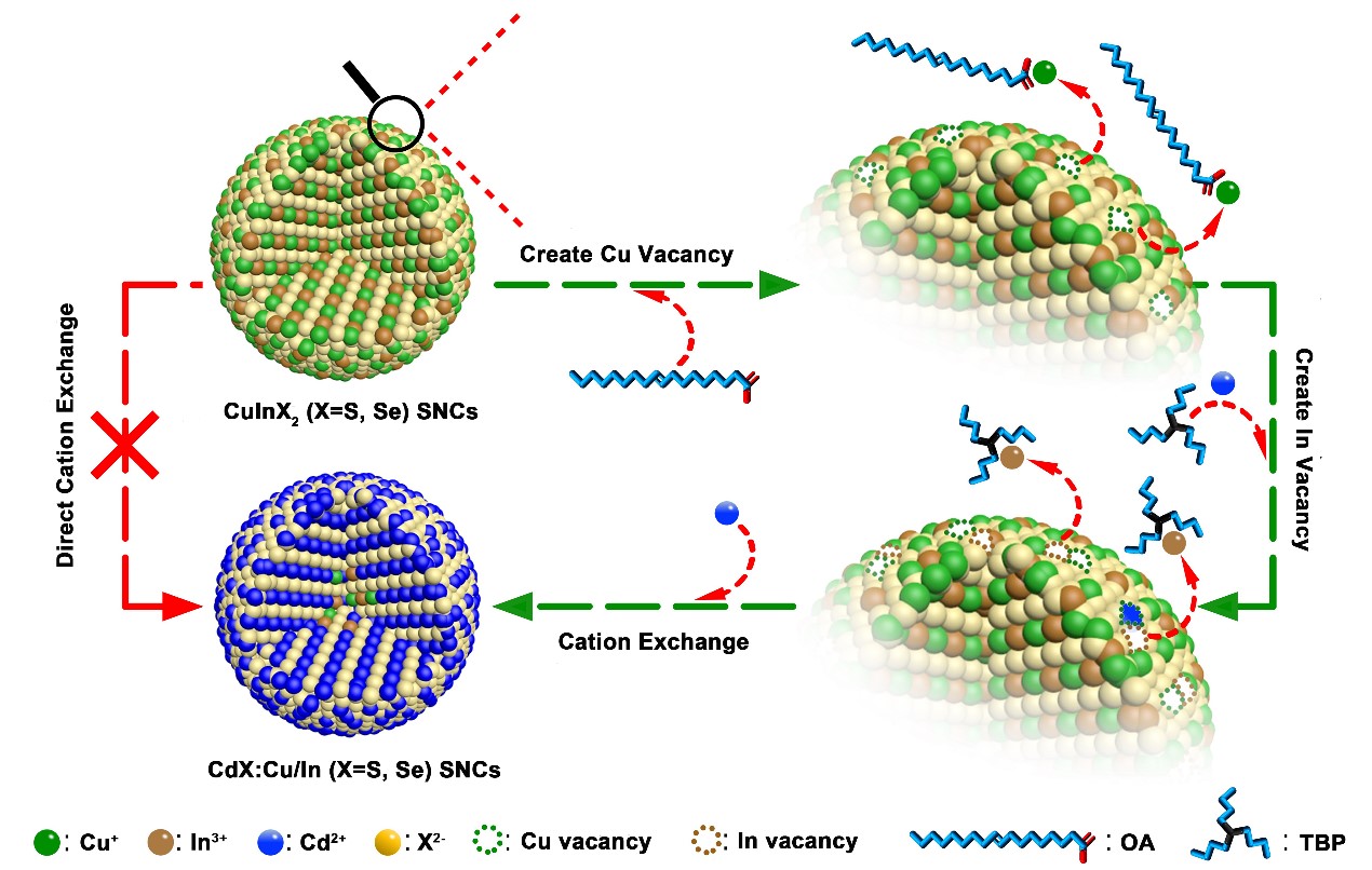 有目的地向纳米晶当中掺入异价杂质,可以引入额外的中间能级、电子/空穴,从而有效调控纳米晶的光学、电学和磁学等性质。受自清洁效应的影响,获得稳定且高效的掺杂纳米晶较为困难,尤其是在多元体系实现可控双掺杂。张加涛课题组以CuInX2(X="S," Se)纳米晶为起始材料,开发了一种表面空位工程诱导的离子交换法,通过在表面精准的创造Cu空位和In空位,极大地降低了反应的动力学势垒,使动力学上很难实现的反应很容易实现,成功制备了Cu、In双掺杂的CdX和ZnX纳米晶/量子点。该方法具有一定的普适性,可实现更多的硫属半导体纳米晶材料的精准组分、掺杂调控。