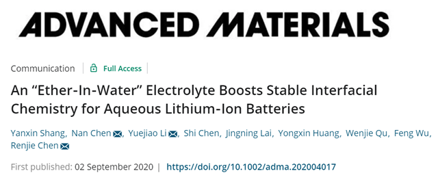文献链接:An “Ether-In-Water” Electrolyte Boosts Stable Interfacial Chemistry for Aqueous Lithium-Ion Batteries. Adv. Mater. , 2020, DOI:10.1002/adma.202004017。