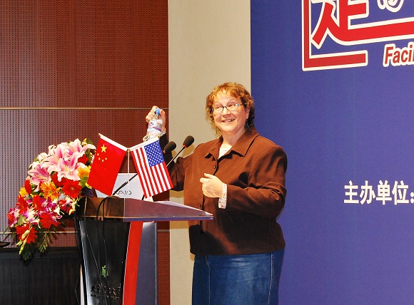 开幕式结束后,美国英语协会官员Stephanie Diamond女士发表了题为“美国地理与美国人”的精彩演讲,她以美国区域划分为主线,生动而详细地介绍了不同区域美国人的构成和特点,介绍了美国人的总体价值观念,为在场的同学和老师上了一堂精彩的美国文化课。演讲结束后,Stephanie Diamond女士热情回答了同学们关于美国大学、中美文化差异和文化适应方面的问题。