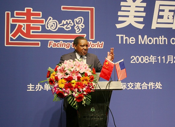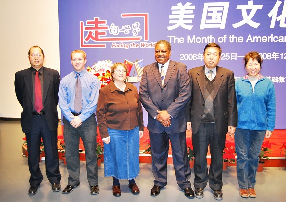 2008年11月25日下午,“走向世界——美国文化月”开幕式暨美国文化概况演讲活动在我校良乡校区举行。李和章副校长和美国驻华使馆公使衔新闻文化参赞Don Q Washington先生出席开幕式并致辞。