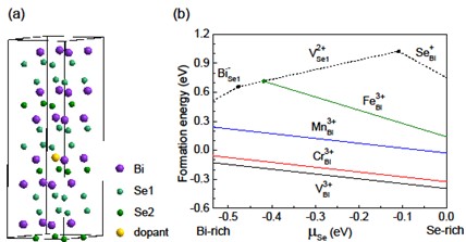 图1. (a) 2×2×1 Bi2Se3超胞原子掺杂结构示意图。(b) V, Cr, Mn 和Fe掺杂Bi2Se3体系最稳定价态的形成能随制备环境(硒化学势)的变化。为比较,虚线给出了Bi2Se3中最可能存在的本征缺陷(硒空位VSe1、BiSe1和SeBi反位)的数值。