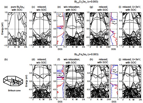 图3. 2×2×1 Bi2Se3超胞(a)考虑自旋轨道耦合下的能带图及其(b)布里渊区和高对称点。(c)-(j) Cr和Fe掺杂Bi2Se3体系不同条件下的能带结构。
