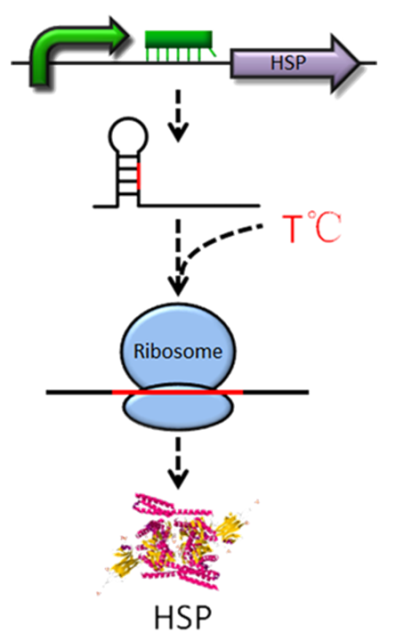 下图展示的是微生物自主耐热系统的原理图,如图所示的是利用RNA热敏开关控制基因开启,表达功能基因热激蛋白(Hsp)的过程。