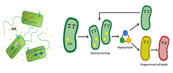 下图所示的是群体感应和数量控制系统的原理图,从群体感应到震荡,最后到细胞凋亡,以达到控制数量的目的。