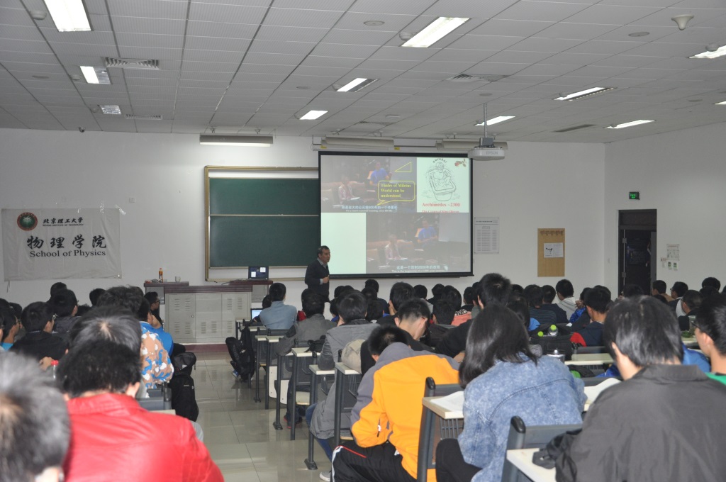 2013年10月28日晚,为使同学们更好地认识物理、理解物理、加深对学习物理的兴趣,物理学院特请来中国科学院物理所曹则贤教授,在良乡校区开展了一次主题为“什么是物理”的精彩讲座。物理学院院长助理史庆藩老师,物理学院辅导员冯卓老师和全校近300名同学参加了这次讲座。