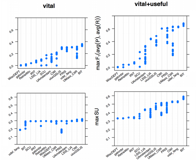 我校计算机学院博士生王金刚(指导老师:宋丹丹、廖乐健)在于2013年11月19日—11月22日美国盖色斯堡举行的第22届国际文本检索大会(Text Retrieval Conference,TREC2013)上的知识库加速-累积引文推荐竞赛(TREC Knowledge Base Acceleration - Cumulative Citation Recommendation ,KBA-CCR)中获取三项全球第一的佳绩。