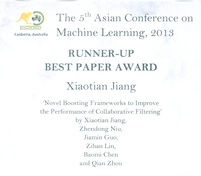 日前,我校计算机学院硕士研究生江小天等人(指导教师:牛振东)的论文"Novel Boosting Frameworks to Improve the Performance of Collaborative Filtering"被国际会议ACML2013录用为长文,并获得此次会议的“Runner-Up Best Paper”奖。