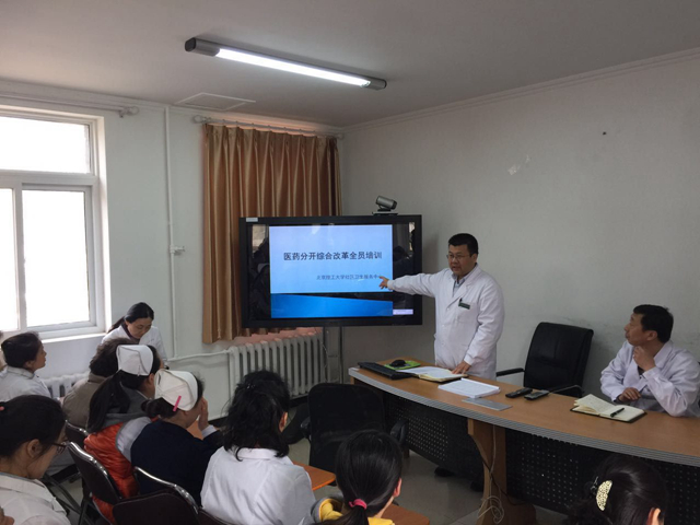 校医院先后多次召开院务会、科室主任会和全体医务人员大会,认真学习、解读北京市医药分开综合改革实施方案和学校医药分开综合改革实施方案,对可能产生的问题和矛盾制定了应急工作预案,并密切关注北京市各项实施细则的陆续出台,及时调整工作方案。中关村和良乡两校区从医院信息系统更新维护,到药品遴选、采购、调配,重点人员及重点专项培训等一系列准备工作扎实、精细、有序,全力保证bb贝博医药分开综合改革的顺利实施。