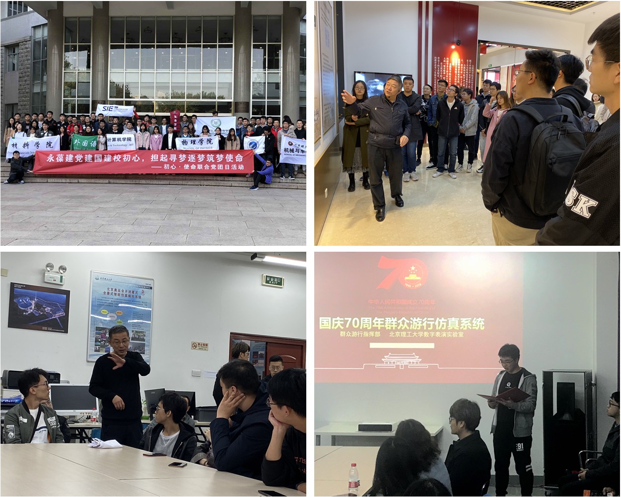 本次展览共有来自21个单位的1000余名党团员参观,其中教职工近300人,学生近800人。在吸引师生们作为参观者接受教育的同时,物理学院党委还发挥教师党员的教育引领作用,邀请了物理学院退休党员范天佑老师、自动化学院退休党员李兆民老师、留学生中心谢非老师与师生党团员们分享参展学习体会;在“初心、使命”联合党团日活动中,邀请了计算机学院党委书记丁刚毅教授介绍国庆70周年庆祝活动、邀请校史馆王民馆长为学生做校史讲解……教师们结合自己的工作实际现身说法,使得教育内容更加鲜活,增强了教育效果,发挥了教育实效。