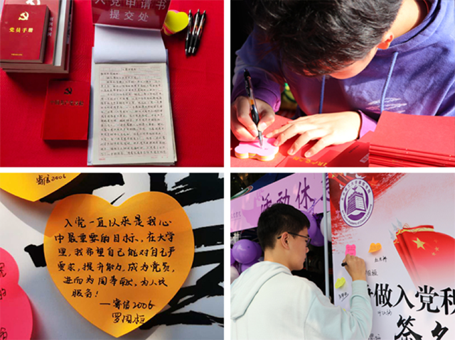 在2020级本科生入学报到日,在睿信书院“争做2020级首批入党积极分子”签名墙上,一张张心形小纸条拼成了党徽的形状,纸条上写满了同学们对于加入中国共产党的向往和对于未来报效祖国、服务人民的情怀。
