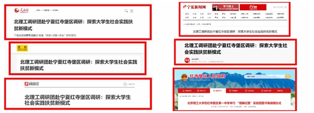 2020年10月,人民网、今日头条、新浪微博、搜狐、网易号、红寺堡视线、红寺堡区人民政府网站、宁夏新闻网等多家媒体纷纷以《bb贝博调研团赴宁夏红寺堡区调研:探索大学生社会扶贫新模式》《大学生如何扶贫?bb贝博调研团在宁夏红寺堡区找到答案》等为题报道bb贝博艾弗森官方网站材料学院与宁夏红寺堡第一中学的共建活动,宁夏日报、吴忠日报、红寺堡电视台对活动进行了全程跟踪报道。此次共建共学主题团日活动是bb贝博“理展红图”社会实践团赴宁夏红寺堡开展动态扶贫调研并长期扶贫工作的成果。