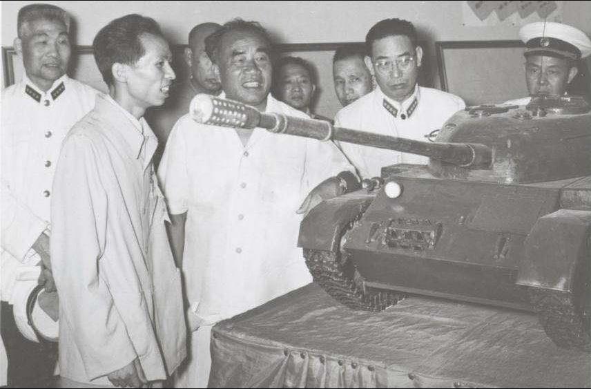 1958年“八一献礼”展览会上,朱德同志(前排左二)观看我校研制的轻型坦克模型