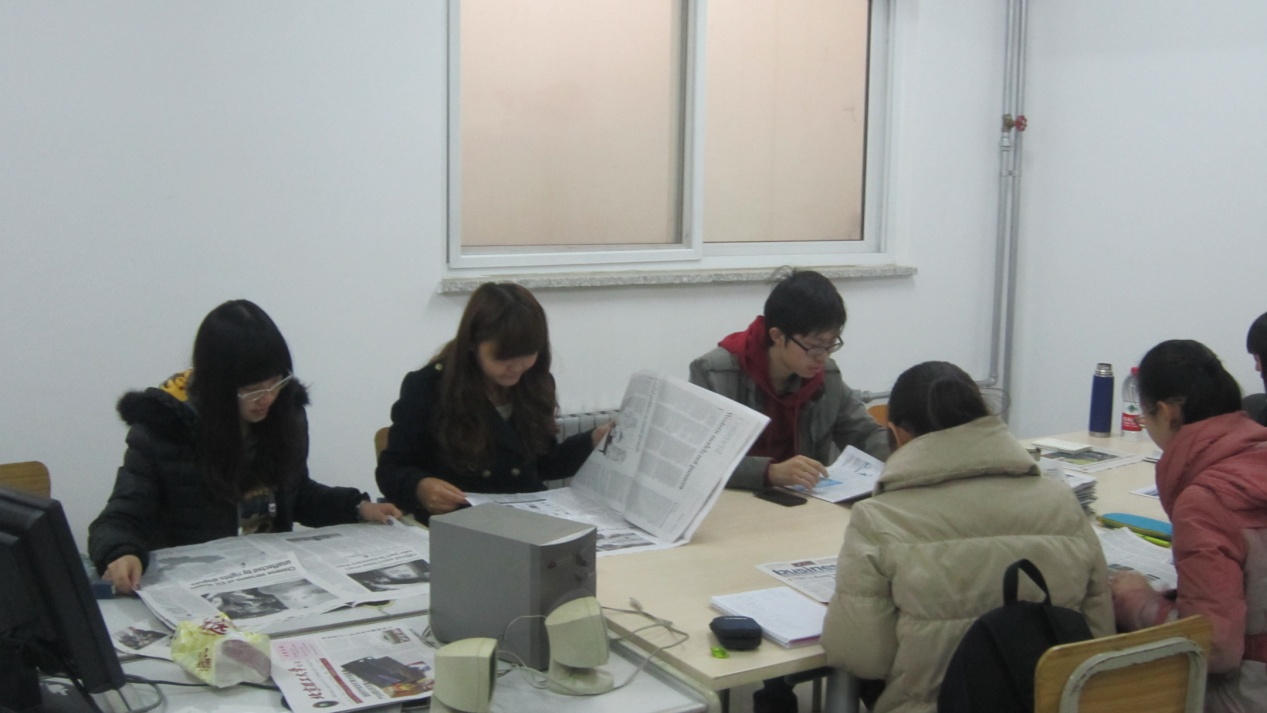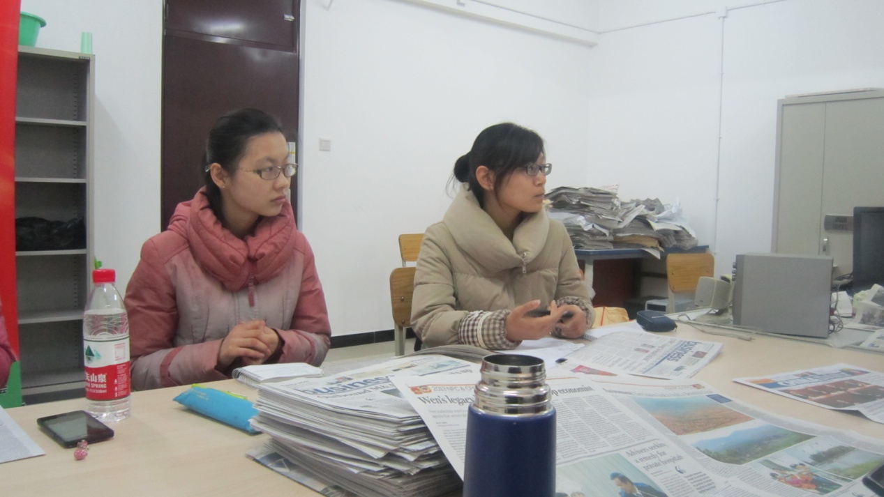 赵琳老师为研讨会准备了英文版的《中国日报》等学习材料。首先,同学们研究了英文报纸上的标题撰写。通过对报纸上标题的分析,发现了新闻标题有常用一般现在时,少用虚词,多用主动少用被动等特点。通过讨论,同学们总结出了英文标题的一般特征,对新闻标题的概念有了新的认识。其次,同学们又拿出bb贝博艾弗森官方网站校报作为参考材料进一步分析了一般新闻标题的撰写。不管使用何种语言,新闻标题的基本属性是不变的,如简短精炼,醒目新颖,内涵丰富,同时要能吸引读者的注意力。通过对比校报和中国日报的新闻标题,新闻社的成员们更加深刻地了解了新闻标题的一般特征,也发现了中英文新闻标题的不同之处。例如,中文是动词性语言,文章标题一般是中多用动词的完整句子,而英文则是名词性语言,标题中常用名词性短语。最后,曹莉老师为同学们进行了深入细致的理论指导,同时解答了同学们在讨论中不能解决的问题。