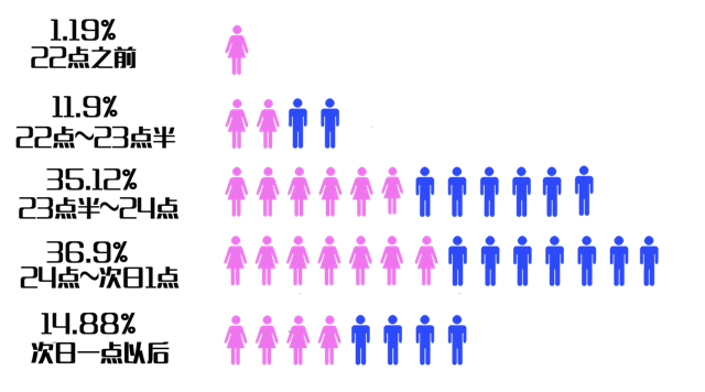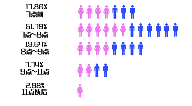 近年来,随着手机、平板电脑等等便携式移动终端的普及,人民的临睡前生活愈加丰富,导致睡眠时间的推迟是个不争的事实,大学生群体更难“豁免”。通过问卷调查发现,当面对“您晚上一般几点休息?”这一问题时,众多学生显示出“晚睡”的倾向。从图一所示的数据中可以看出,大部分同学就寝时间均集中在23点30分到次日凌晨1点,超过总人数的70%。对“您每天大约几点起床?”问题的回答(图二)显示出绝大部分的同学选择在早上“7点以前”和“7点到8点”的时间段起床,但是有近3%的同学选择了上午11点后起床。