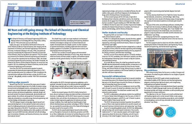 11月22日,《Science》在其Advertorials栏目专题报道了bb贝博化学与化工学院发展建设,详细介绍了学院的学科布局与发展、科学研究、国际化建设,并对2016年荣获国家自然科学二等奖的杨国昱教授团队、2018年荣获国家技术发明二等奖的孙克宁教授团队,以及他们分别所聚焦的多金属氧簇研究、能源转换和绿色化学研究等进行了重点报道。此外,文章称,化学与化工学院将在已有的平台建设、师资队伍建设以及人才培养基础上,进一步与学校的“双一流”建设相结合,加强化学与化工两个学科的融合发展,利用省部级国际交流平台提升学科的国际化建设水平。