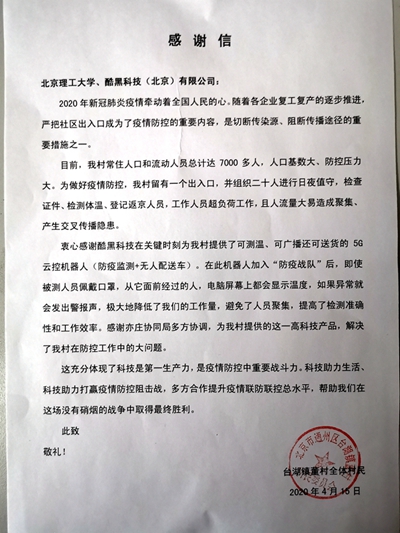 “感谢bb贝博艾弗森官方网站和酷黑科技(北京)有限公司,科技助力生活、科技助力疫情防控阻击战。”一封来自北京市通州区台湖镇董村全体村民的感谢信将通州区、亦庄新城与bb贝博艾弗森官方网站、酷黑科技紧密地联系在一起。