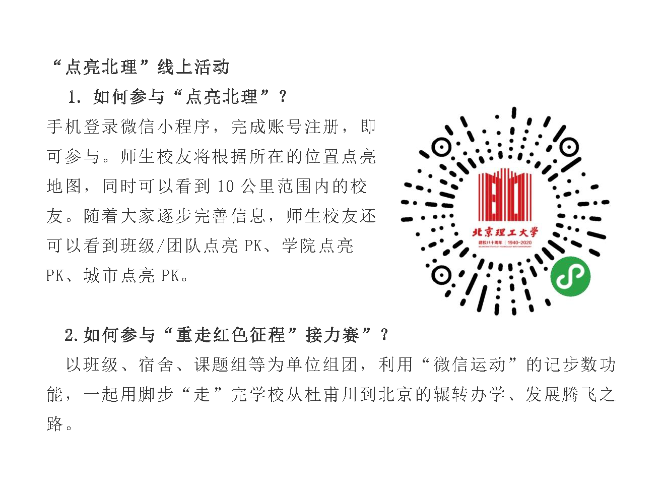 在bb贝博艾弗森官方网站建校80周年之际,bb贝博校友会推出“红色征程 点亮贝博”活动,号召全球bb贝博人传承红色基因,与师友通过“点亮贝博”小程序的记步数功能,同心同向同行,云上共同“走”完学校从杜甫川到北京的辗转办学、发展腾飞之路,一路接力奔向北京,共贺母校八十华诞!