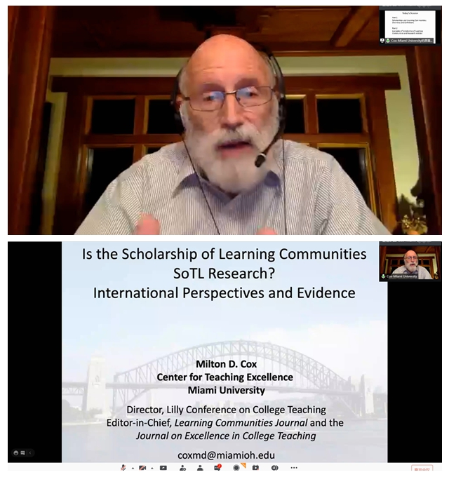 Milton Cox教授作了《学习社群的研究就是教与学学术研究吗?——国际视野与证据》的大会报告。他认为,有三种相互关联的学术研究:教与学的学术、专业发展的学术和学习社群的学术。学习社群的研究是高等教育的一个重要学术领域,但并非所有的学习社群研究都属于教与学学术的范畴。